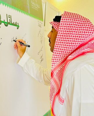 وتوشح مبنى الغرفة باللون الأخضر، كما نُصبت عدد من اللوحات الوطنية التي جسدت روح الانتماء والولاء، وشارك مشتركو الغرفة ومراجعوها في كتابة رسائلهم الوطنية على الجدارية تعبيرًا عن اعتزازهم وفخرهم بالوطن وقيادته الرشيدة.