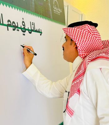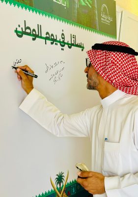 وتوشح مبنى الغرفة باللون الأخضر، كما نُصبت عدد من اللوحات الوطنية التي جسدت روح الانتماء والولاء، وشارك مشتركو الغرفة ومراجعوها في كتابة رسائلهم الوطنية على الجدارية تعبيرًا عن اعتزازهم وفخرهم بالوطن وقيادته الرشيدة.