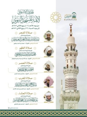أعلنت رئاسة الشؤون الدينية بالمسجد الحرام والمسجد النبوي عن الجدول الأسبوعي لأئمة المسجد الحرام والمسجد النبوي من يوم الأحد ٦ ربيع الآخر إلى يوم السبت ١٢ ربيع الآخر ١٤٤٧هـ على النحو التالي :