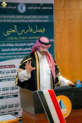 شهدت جامعة كفر الشيخ مناقشة رسالة الماجستير للطالب السعودي فيصل فارس الشهيب العتيبي، والتي جاءت بعنوان “[العلاقة بين تمارين التقوية بالايزوكينيتك ووظائف الأداء الحركي لدى الأطفال المصابين بشلل الأطراف السفلية”]”.
