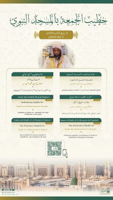 أعلنت رئاسة الشؤون الدينية بالمسجد الحرام والمسجد النبوي، عن أسماء خطيبي وأئمة صلاة الجمعة في الحرمين الشريفين 11 ربيع الآخر 1447هـ وذلك ضمن جدولها الدوري لتنظيم الإمامة والخطابة.