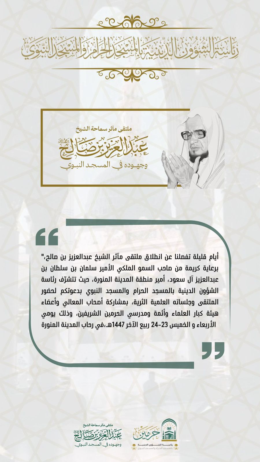 أيام قليلة تفصلنا عن انطلاق ملتقى مآثر الشيخ عبدالعزيز بن صالح، برعاية كريمة من صاحب السمو الملكي الأمير سلمان بن سلطان بن عبدالعزيز آل سعود، أمير منطقة المدينة المنورة، حيث تتشرّف رئاسة الشؤون الدينية بالمسجد الحرام والمسجد النبوي بدعوتكم لحضور الملتقى وجلساته العلمية الثرية، بمشاركة أصحاب المعالي وأعضاء هيئة كبار العلماء وأئمة ومدرسي الحرمين الشريفين، وذلك يومي الثلاثاء والأربعاء 23–24 ربيع الآخر 1447هـ، في رحاب المدينة المنورة.”