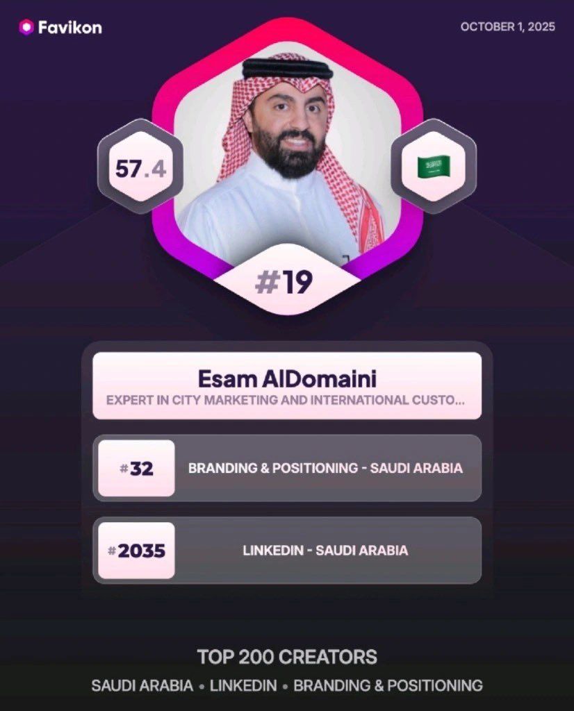في إنجاز يُعبّر عن حضور قوي وتأثير متصاعد في مجال تسويق المدن وبناء العلامات التجارية، أدرجت منصة Favikon المتخصصة في تحليل وتصنيف صنّاع المحتوى حول العالم الأستاذ عصام الدميني ضمن قائمة أفضل 200 صانع محتوى في المملكة العربية السعودية لعام 2025، محققًا المركز التاسع عشر (#19) على مستوى الدولة.