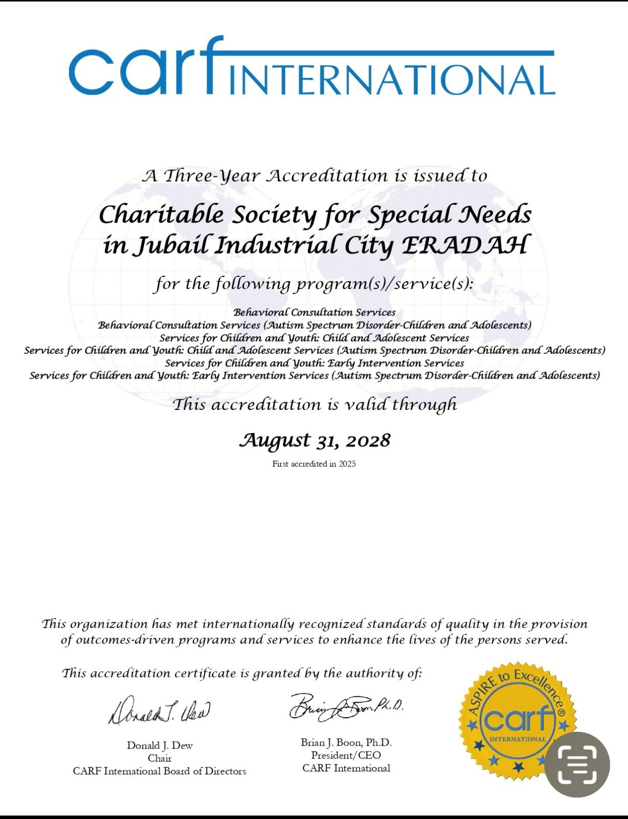 أحرزت جمعية إرادة بالجبيل الصناعية إنجازًا نوعيًا جديدًا وذلك بحصولها على اعتماد منظمة (CARF) الدولية، المنظمة الأبرز عالميًا في تقييم مؤسسات الرعاية والتأهيل والخدمات الصحية والاجتماعية، والتي تعتمد في تقييمها على أعلى معايير الجودة الدقيقة والتي تشمل مراجعة كافة السياسات والممارسات والآليات المتبعة. وتفخر جمعية إرادة بهذا الاعتماد الذي جاء بعد تقييم دقيق أجرته المنظمة شمل جميع المدارس والمراكز في مختلف مجالات عملها.