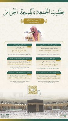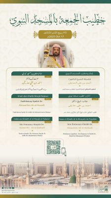 أعلنت رئاسة الشؤون الدينية بالمسجد الحرام والمسجد النبوي، عن أسماء خطيبي وأئمة صلاة الجمعة في الحرمين الشريفين 25 ربيع الآخر 1447هـ وذلك ضمن جدولها الدوري لتنظيم الإمامة والخطابة.