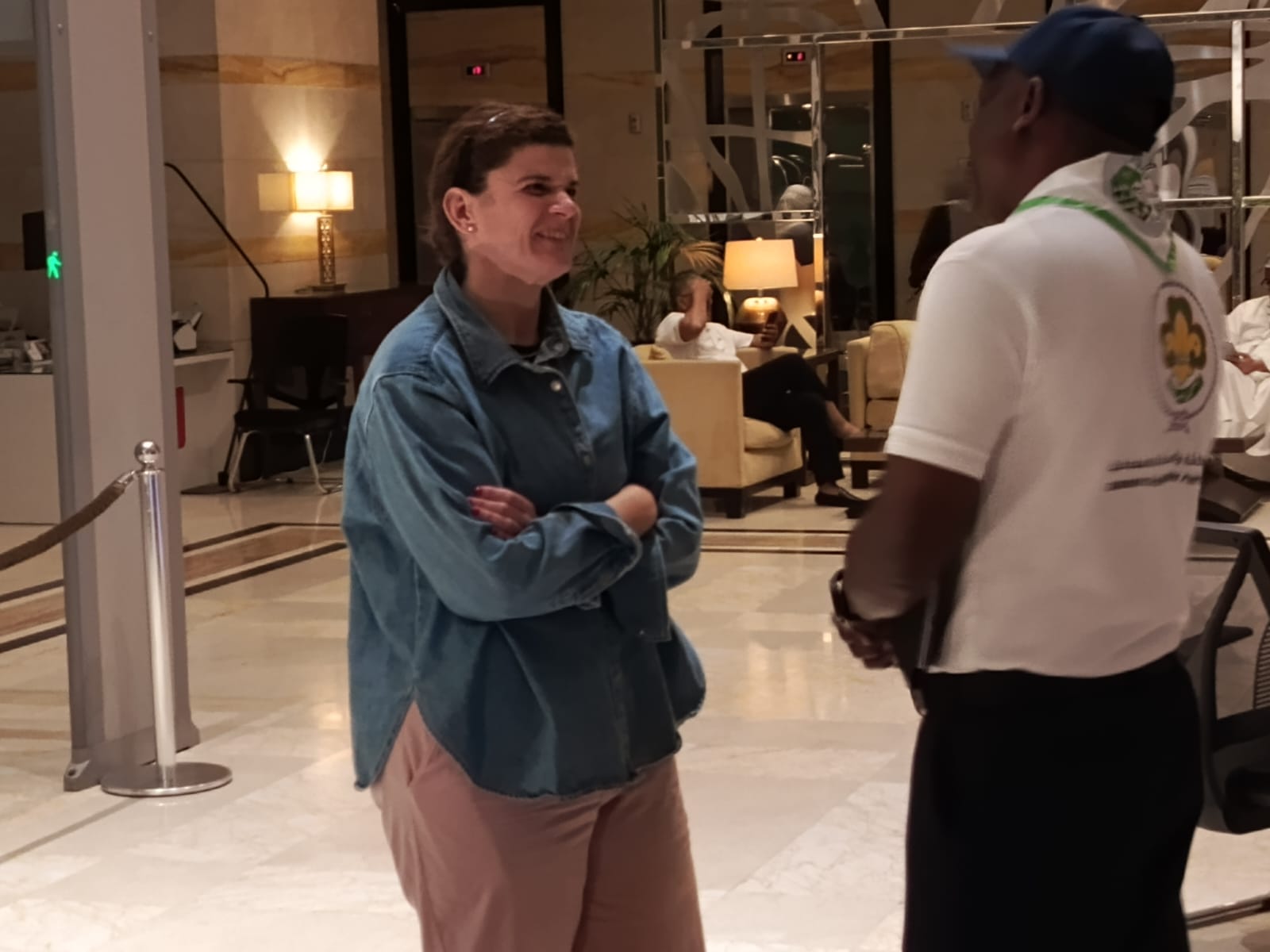 مشهدٌ يعكس التفاعل البشري والروح الودية التي يتمتع بها القادة الكشفيون، وكيف يضفون جوًا من الحميمية والاحترام المتبادل حتى في أجواء المؤتمرات الرسمية.