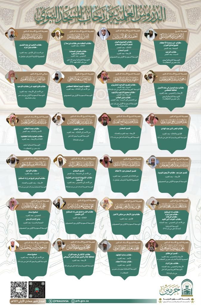 رئاسة الشؤون الدينية بالمسجد الحرام والمسجد النبوي تعلن عن جدول البرنامج العلمي الدائم بالمسجد النبوي لشهر جمادى الأولى 1447هـ، والذي يضم دروسًا علمية ومحاضرات شرعية يقدمها نخبة من أصحاب الفضيلة أئمة ومدرّسي المسجد النبوي، ضمن جهود الرئاسة في نشر العلم وتعزيز الوعي الديني لدى قاصدي مسجد رسول الله ﷺ.
