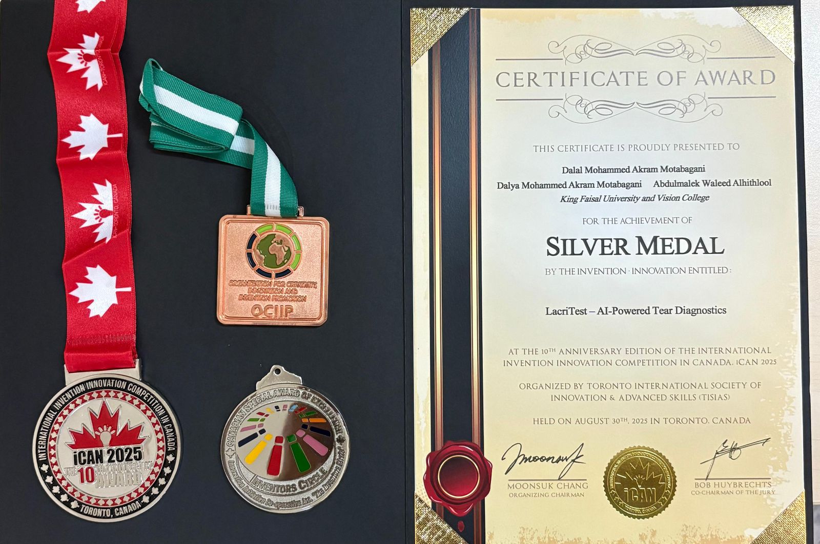 ولم يتوقف التميز عند حدود كوريا، بل امتد إلى القارة الأمريكية، حيث حصد الفريق ذاته الميدالية الفضية والجائزة الدولية الخاصة خلال مشاركته في النسخة العاشرة من المسابقة الدولية للاختراعات والابتكارات في كندا (iCAN)، في إنجاز مزدوج يعكس عمق الإبداع البحثي وثراء الفكر العلمي السعودي.