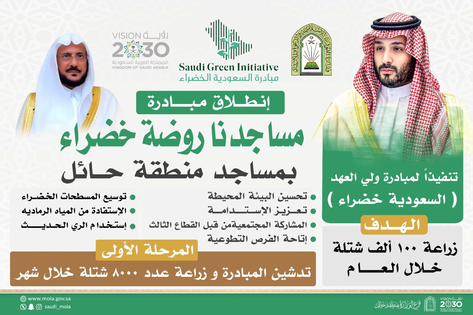 دشَّن معالي وزير الشؤون الإسلامية والدعوة والإرشاد الشيخ الدكتور عبداللطيف بن عبدالعزيز آل الشيخ، مساء أمس الأحد الرابع من شهر جمادى الأولى لعام 1447هـ، مبادرة “مساجدنا روضة خضراء”، وذلك خلال زيارته التفقدية لفرع الوزارة في منطقة حائل، في إطار الجهود التي تواكب مبادرة “السعودية الخضراء” التي أطلقها صاحب السمو الملكي الأمير محمد بن سلمان بن عبدالعزيز، ولي العهد رئيس مجلس الوزراء – حفظه الله –.