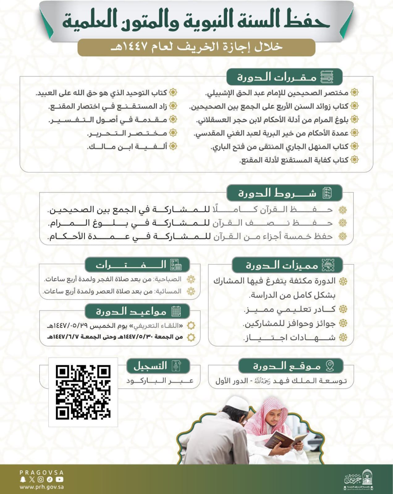 📅 موعد الدورة: من يوم الجمعة 30 جمادى الأولى 1447هـ، وحتى يوم الجمعة 7 جمادى الآخرة 1447هـ.