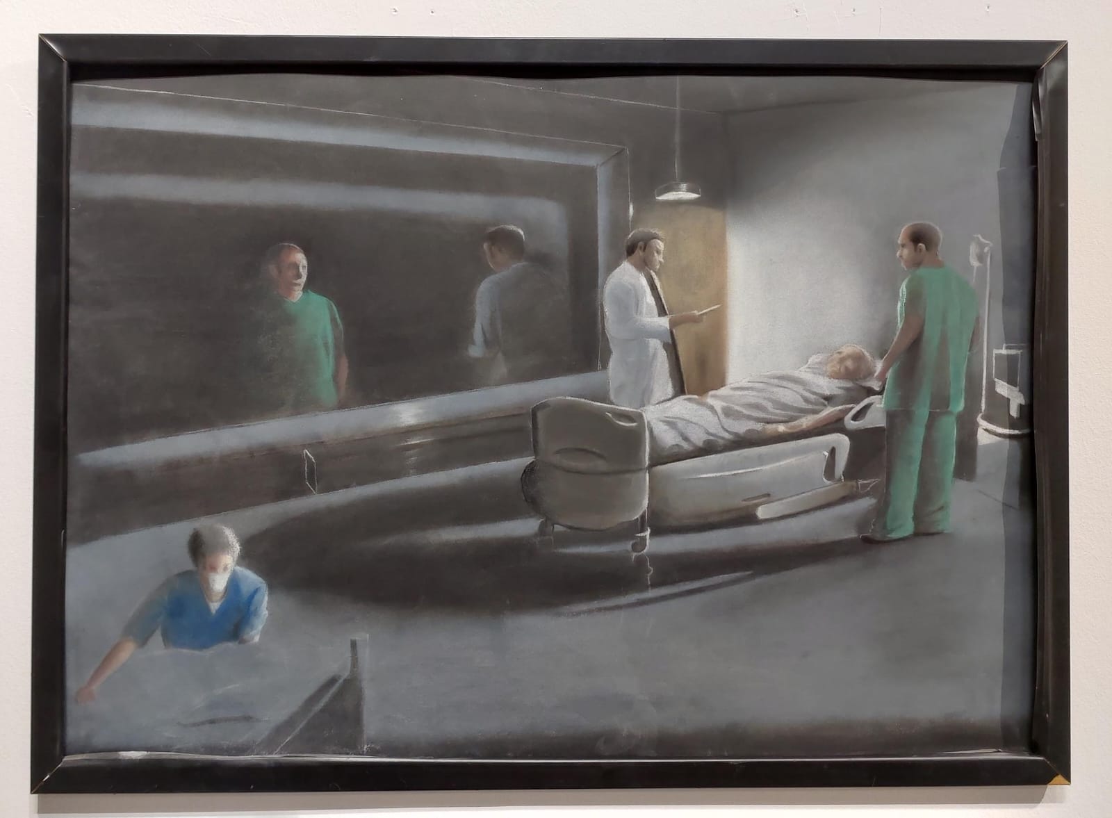 واللوحة عبارة عن : تجسيد للحظة إنسانية خالصة تجمع بين الضعف البشري وقوة العلم وعمق العناية، مما يثير في نفس المشاهد مشاعر التعاطف الترقب والأمل إنها دعوة للتأمل في قيمة الحياة وأهمية الرعاية وعظمة اللحظات التي تجمع بين البشر في أوقات الحاجة.