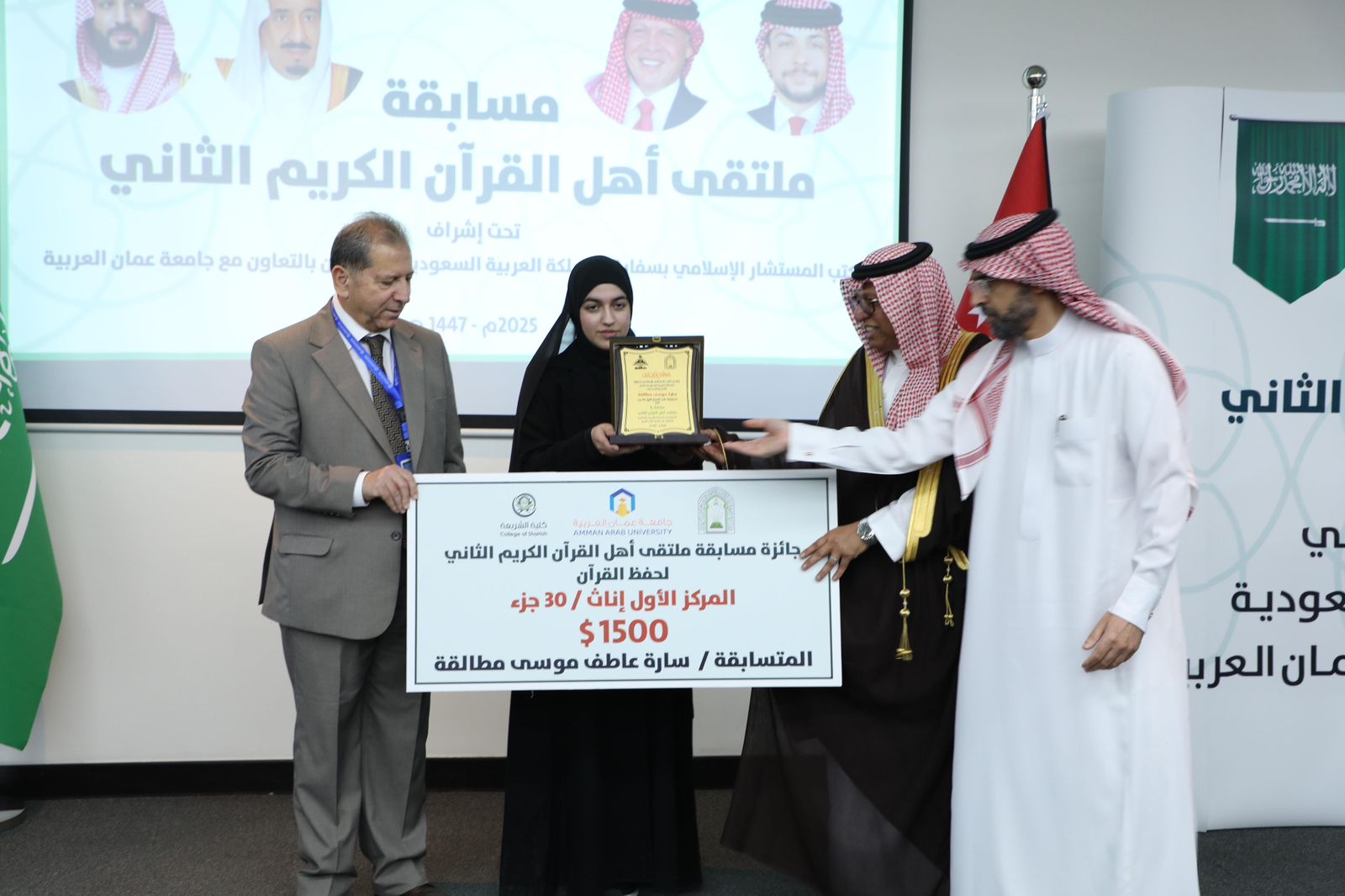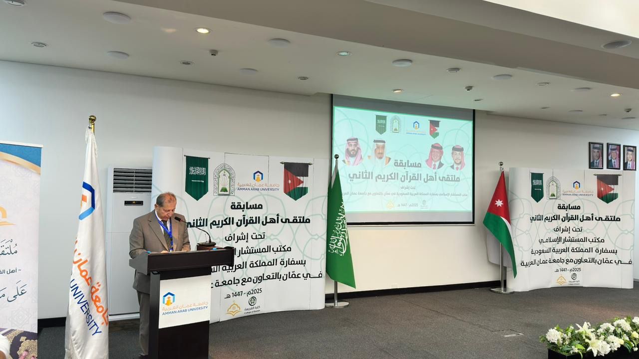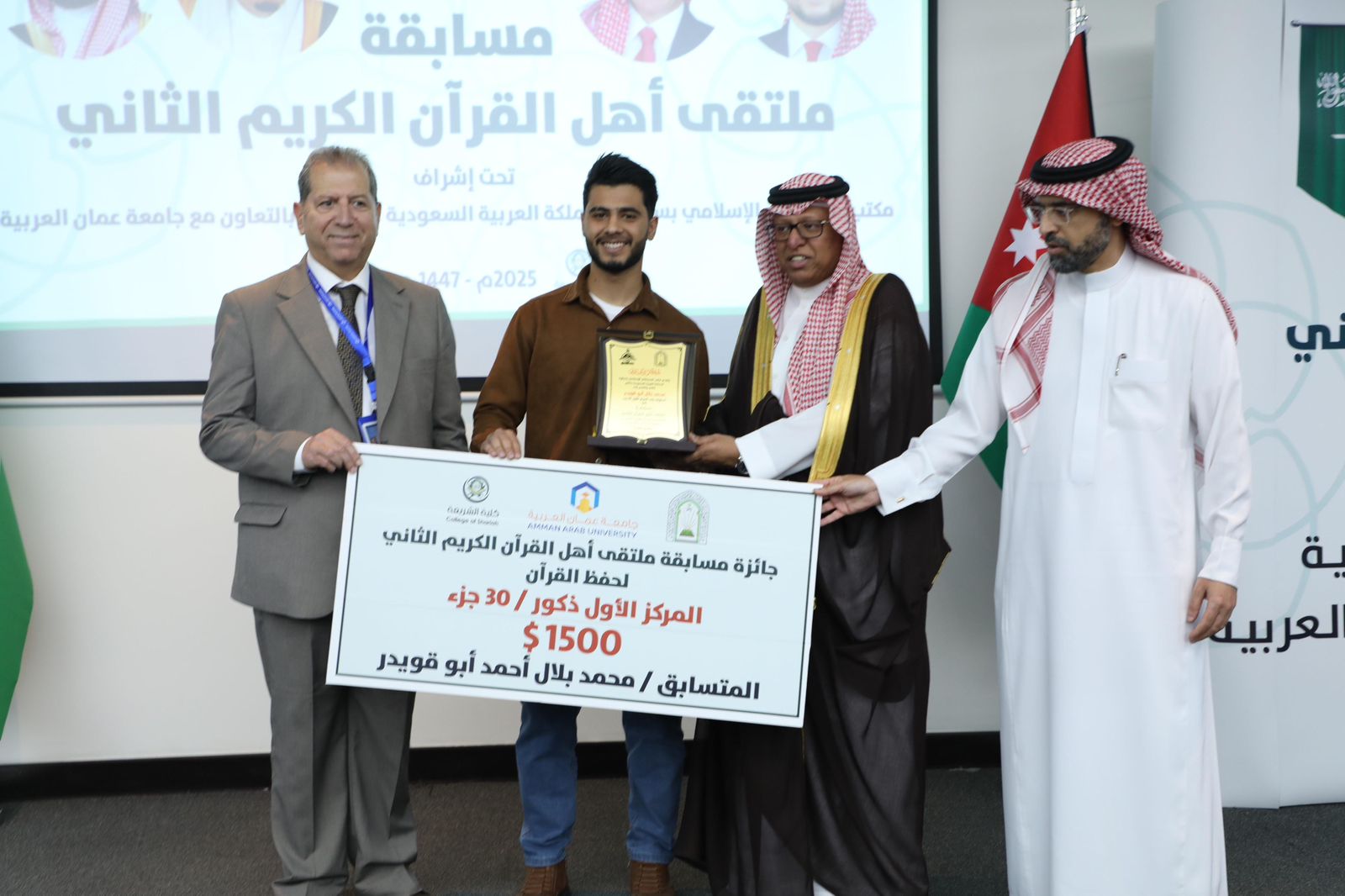 كما شكر إدارة جامعة عمّان العربية على تعاونهم المثمر في إنجاح فعالياتها، مباركًا للفائزين والفائزات تفوقهم وتميّزهم في حفظ كتاب الله تعالى.