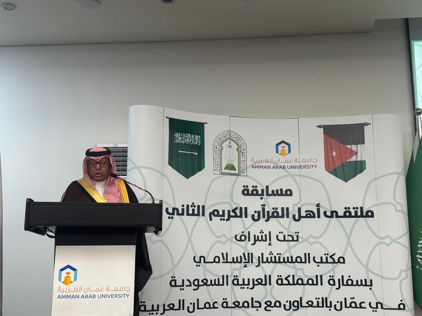 وخلال الحفل الختامي ألقى نائب سفير خادم الحرمين الشريفين في عمّان الأستاذ محمد بن حسن مؤنس كلمةٍ أكد أن المسابقة تأتي امتدادًا لجهود المملكة العربية السعودية في خدمة القرآن الكريم والعناية بحفظته في مختلف أنحاء العالم، تنفيذًا لتوجيهات القيادة الرشيدة ـ حفظها الله ـ في نشر رسالة القرآن الكريم، وترسيخ قيم الوسطية والاعتدال، وتعزيز الروابط الأخوية بين الشعبين الشقيقين.
