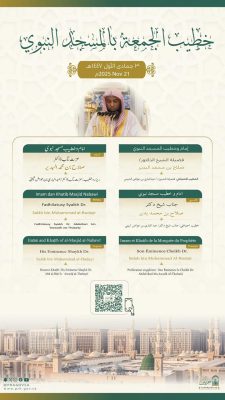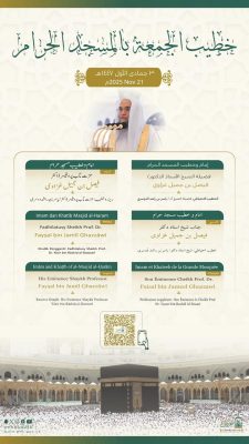 أعلنت رئاسة الشؤون الدينية بالمسجد الحرام والمسجد النبوي، عن أسماء خطيبي وأئمة صلاة الجمعة في الحرمين الشريفين 30 جماد الاولى1447هـ وذلك ضمن جدولها الدوري لتنظيم الإمامة والخطابة.