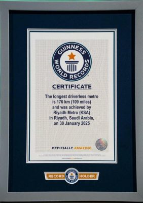 ووثّقت غينيس هذا الإنجاز رسميًا بتاريخ 30 يناير 2025، ليُضاف إلى سلسلة المشاريع الكبرى التي تشهدها المملكة في إطار تطوير البنية التحتية. ويُعد مترو الرياض أحد أضخم مشاريع النقل في الشرق الأوسط، وواحدًا من أبرز نماذج التحول الذي تقوده المملكة نحو النقل المستدام، انسجامًا مع مستهدفات رؤية السعودية 2030 الهادفة إلى تحسين جودة الحياة وتعزيز كفاءة القطاعات اللوجستية.