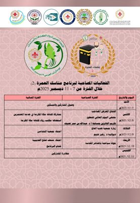 وفي السياق ذاته، أعلن (برناوي) اعتماد فريق عمل إعداد برنامج مناسك العمرة 2 للفعاليات المصاحبة، برئاسة الأمين العام المساعد للاتحاد العربي لرواد الكشافة والمرشدات، الرائد الكشفي علي العلي، مؤكدًا أن هذه الفعاليات ستنفذ خلال أيام الاثنين والثلاثاء والأربعاء، وتتضمن لقاءات وزيارات وبرامج نوعية تعزز تجربة المشاركين وتنمي أثر الرحلة.