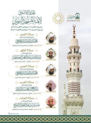 اعتمدت رئاسة الشؤون الدينية بالمسجد الحرام والمسجد النبوي الجدول الأسبوعي لأصحاب الفضيلة أئمة الحرمين الشريفين، للفترة من يوم الأحد 16 جمادى الآخرة إلى يوم السبت 22 جمادى الآخرة 1447هـ، وذلك ضمن جهودها لتنظيم الصلوات وتيسير متابعتها لعموم المصلين والزوار.