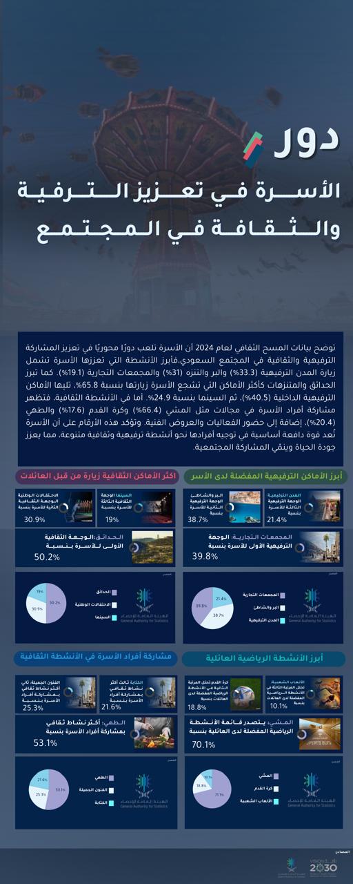 تؤكد بيانات المسح الثقافي لعام 2024 الصادر عن الهيئة العامة للإحصاء أن الأسرة السعودية تؤدي دورًا محوريًا في توجيه أنماط الترفيه والمشاركة الثقافية داخل المجتمع، بما ينعكس بشكل مباشر على رفع جودة الحياة وتعزيز التفاعل الاجتماعي بين الأفراد.