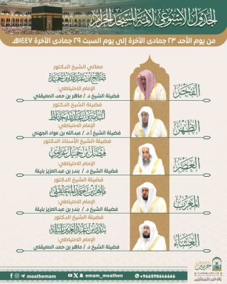 ويأتي اعتماد هذا الجدول في إطار تنظيم شؤون الإمامة بالمسجد الحرام والمسجد النبوي، بما يتيح للمصلين أداء عباداتهم في أجواء روحانية مفعمة بالطمأنينة، وبقيادة أئمةٍ من أهل العلم والخبرة.
