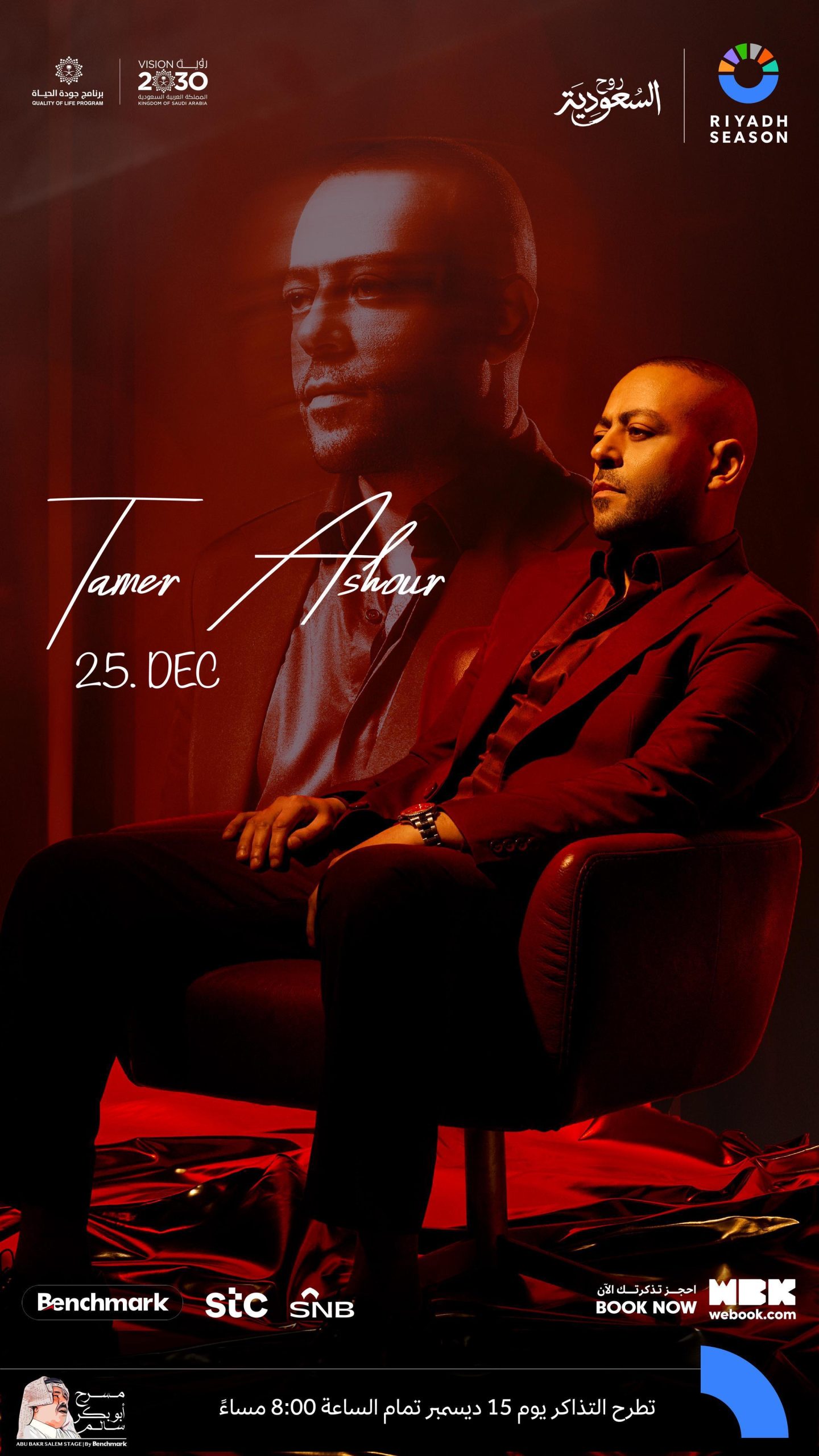 يلتقي الفنان تامر عاشور جمهوره في العاصمة الرياض من خلال حفل غنائي منتظر ضمن حفلات موسم الرياض، وذلك يوم 25 ديسمبر، بتنظيم شركة بنش مارك.