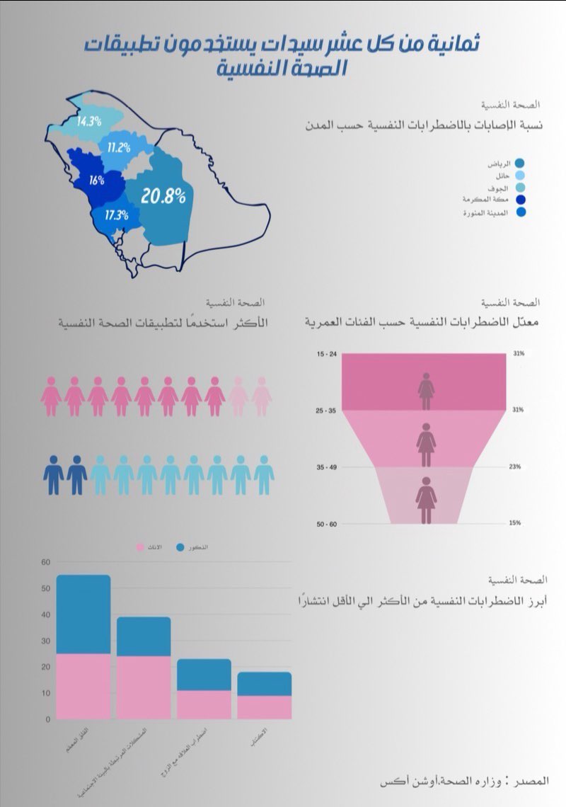 في تقرير حديث حول الصحة النفسية في السعودية، برزت مجموعة من المؤشرات التي تعكس واقع الاضطرابات النفسية ومستوى الوعي وطرق الحصول على الدعم. وأظهرت الرسوم الإحصائية الصادرة عن وزارة الصحة ارتفاعًا ملحوظًا في الانفتاح على العلاج النفسي، حيث بلغت نسبة النساء المنفتحات على تلقي العلاج 83.8%، مقابل 16.2% من الرجال، في دلالة على تطور النظرة المجتمعية تجاه العلاج النفسي.