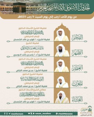 ويأتي اعتماد هذا الجدول في إطار تنظيم شؤون الإمامة بالمسجد الحرام والمسجد النبوي، بما يتيح للمصلين أداء عباداتهم في أجواء روحانية مفعمة بالطمأنينة، وبقيادة أئمةٍ من أهل العلم والخبرة.