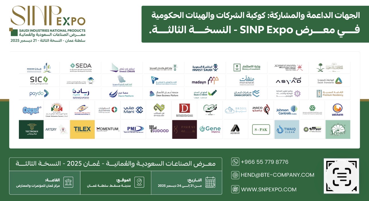 ويستمر معرض الصناعات والمنتجات الوطنية السعودية (SINP Expo) في مسقط حتى 24 ديسمبر، وسط اهتمام واسع من المستثمرين والمهتمين بالقطاع الصناعي والتجاري.