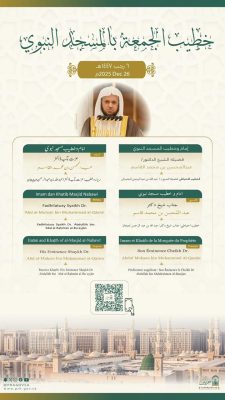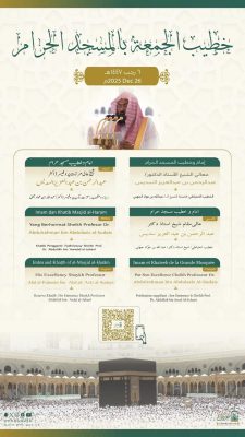 أعلنت رئاسة الشؤون الدينية بالمسجد الحرام والمسجد النبوي، عن أسماء خطيبي وأئمة صلاة الجمعة في الحرمين الشريفين ليوم 6 رجب 1447هـ وذلك ضمن جدولها الدوري لتنظيم الإمامة والخطابة.