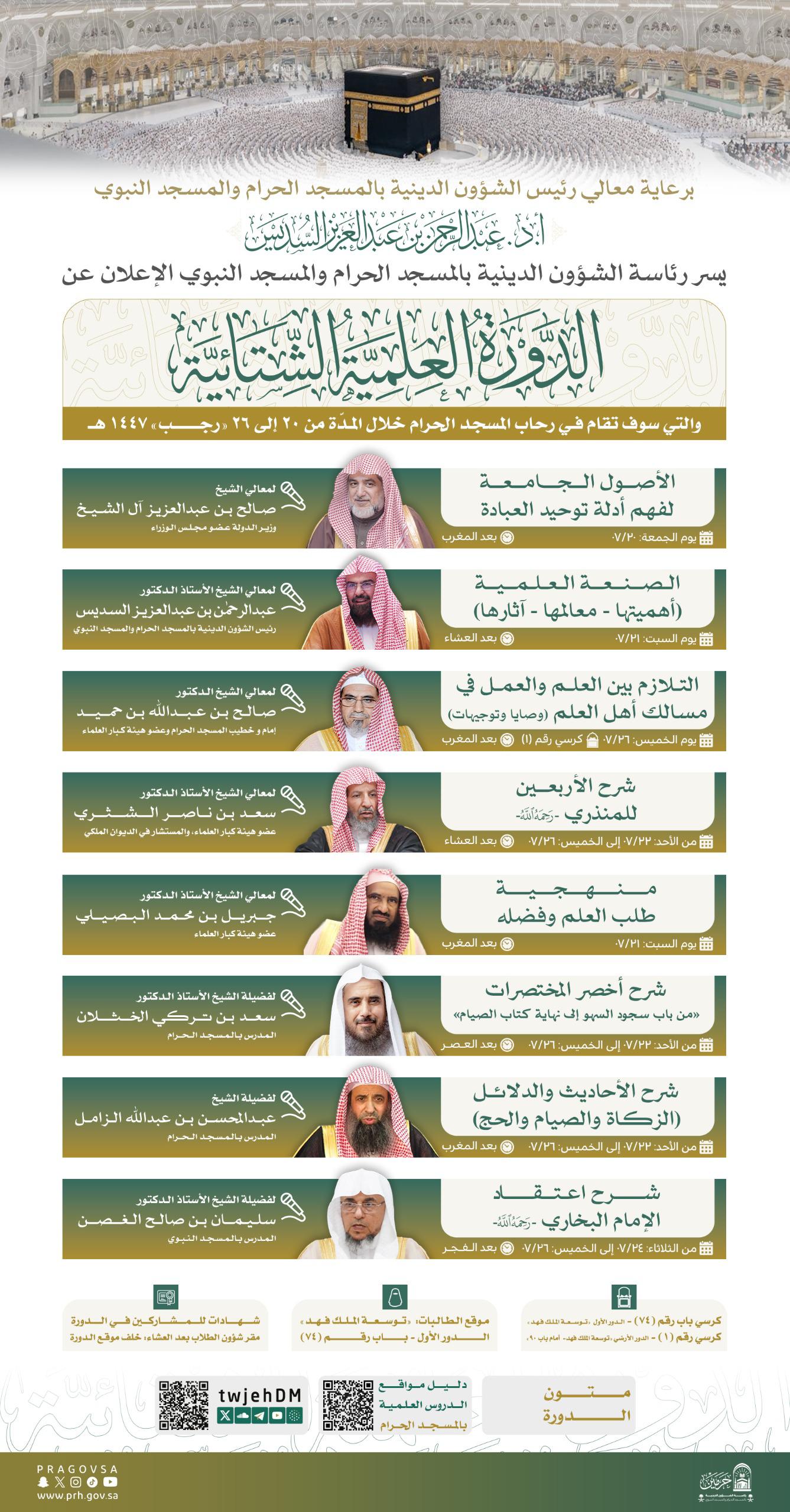 أعلنت رئاسة الشؤون الدينية بالمسجد الحرام والمسجد النبوي عن إقامة الدورة العلمية الشتائية في رحاب المسجد الحرام، وذلك خلال الفترة من 20 إلى 26 رجب 1447هـ.