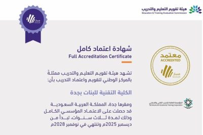 حصلت الكلية التقنية بجدة والكلية التقنية للبنات بجدة على الاعتماد المؤسسي الكامل من هيئة تقويم التعليم والتدريب ممثلةً بالمركز الوطني لتقويم واعتماد التدريب وذلك لمدة ثلاث سنوات تنتهي في نوفمبر 2028م.