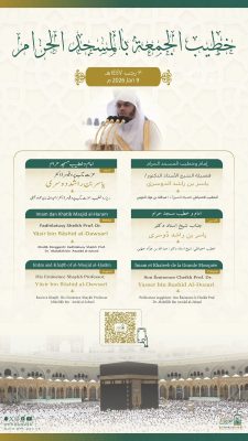 وسيتولى فضيلة الشيخ الأستاذ الدكتور ياسر الدوسري إمامة المصلين وإلقاء خطبة الجمعة في المسجد الحرام.
