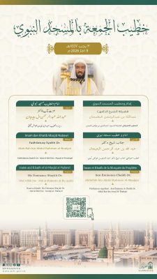 أعلنت رئاسة الشؤون الدينية بالمسجد الحرام والمسجد النبوي، عن أسماء خطيبي وأئمة صلاة الجمعة في الحرمين الشريفين 20 رجب 1447هـ وذلك ضمن جدولها الدوري لتنظيم الإمامة والخطابة.