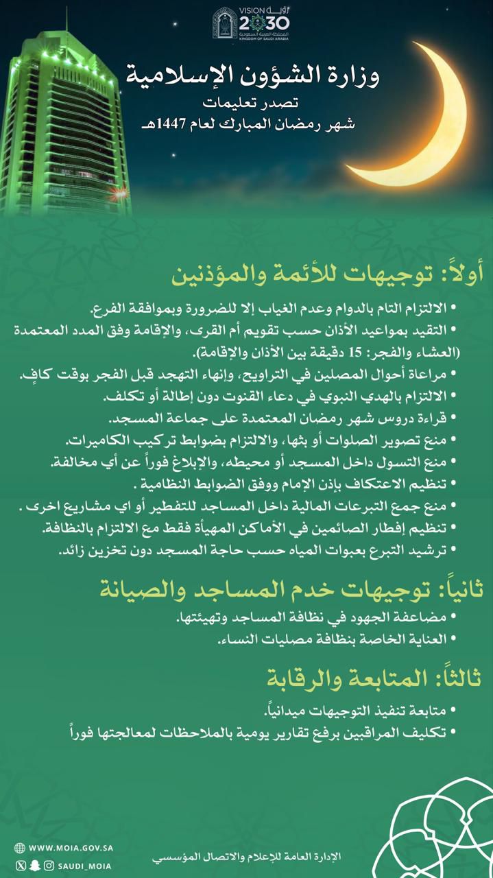 ويأتي هذا التعميم في إطار حرص الوزارة على خدمة بيوت الله، وتوفير أفضل مستويات التنظيم والخدمة للمصلين خلال شهر رمضان المبارك، بما يحقق الرسالة الدعوية والتوعوية للوزارة، انسجامًا مع توجيهات القيادة الرشيدة – حفظها الله – وحرصها على تهيئة المساجد لخدمة المجتمع، وتأمين بيئة صلاة مناسبة لجميع المصلين.