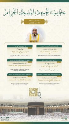 وسيتولى فضيلة الشيخ الدكتور أسامة خياط إمامة المصلين وإلقاء خطبة الجمعة في المسجد الحرام.