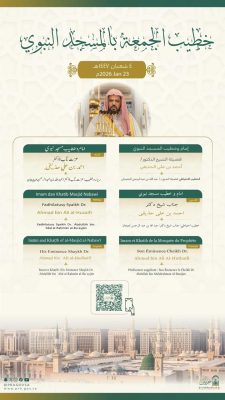 أعلنت رئاسة الشؤون الدينية بالمسجد الحرام والمسجد النبوي، عن أسماء خطيبي وأئمة صلاة الجمعة في الحرمين الشريفين 4 شعبان 1447هـ وذلك ضمن جدولها الدوري لتنظيم الإمامة والخطابة.