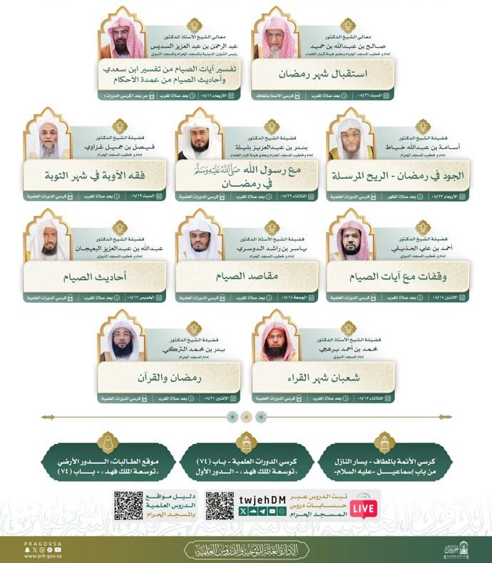 وأوضحت أن الدروس ستُقام في عدد من المواقع داخل المسجد الحرام، مع إتاحة متابعتها عبر المنصات الرقمية الرسمية للرئاسة وحسابات دروس المسجد الحرام، بما يتيح الاستفادة لأكبر شريحة من المسلمين حول العالم.