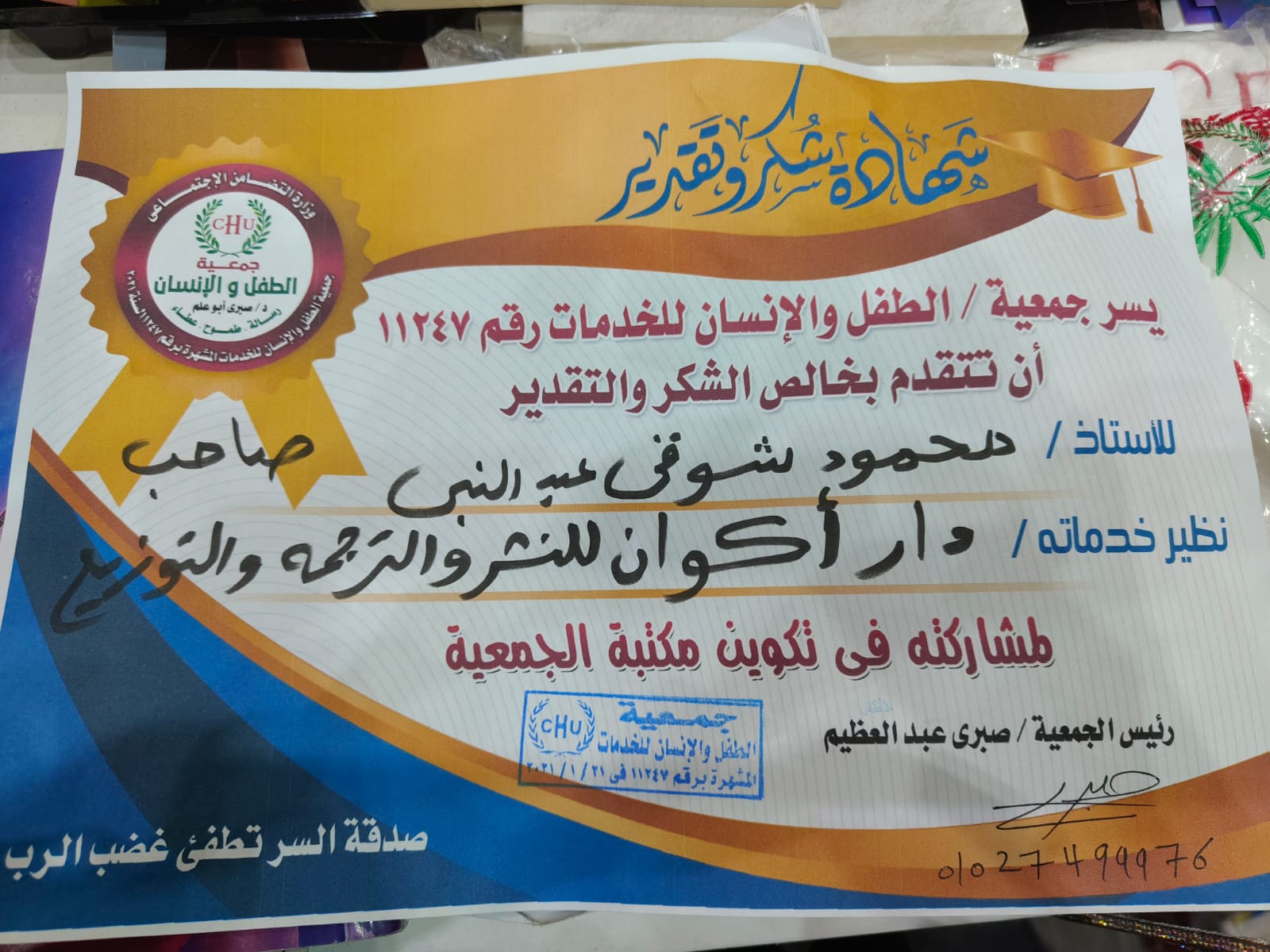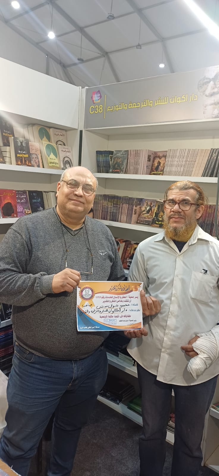 كرمت جمعية الطفل والانسان ، دار اكوان للنشر والترجمة والتوزيع نظير مساهمتها في انشاء مكتبة الجمعية وتسلم شهادة الشكر صاحب دار اكوان محمود شوقي ، ويتراس الجمعية السيد صبري عبدالعظيم .