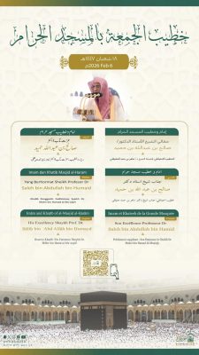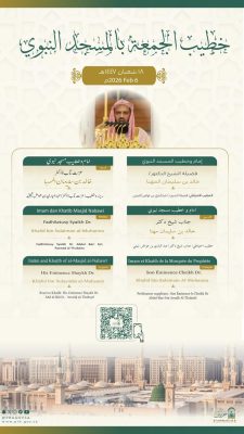 أعلنت رئاسة الشؤون الدينية بالمسجد الحرام والمسجد النبوي، عن أسماء خطيبي وأئمة صلاة الجمعة في الحرمين الشريفين ليوم 18 شعبان 1447هـ وذلك ضمن جدولها الدوري لتنظيم الإمامة والخطابة.