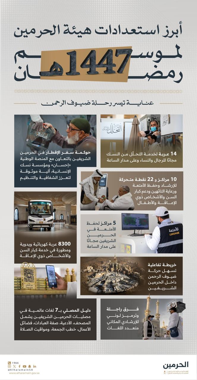 وجددت الهيئة التزامها بتقديم أفضل الخدمات لضيوف الرحمن، تنفيذًا لتوجيهات القيادة الرشيدة- حفظها الله- في العناية بالحرمين الشريفين وقاصديهما، ورفع كفاءة الخدمات المقدمة وتطويرها بما يواكب الأعداد المتزايدة من المعتمرين والمصلين، ويسهم في إثراء تجربتهم الإيمانية خلال شهر رمضان المبارك.