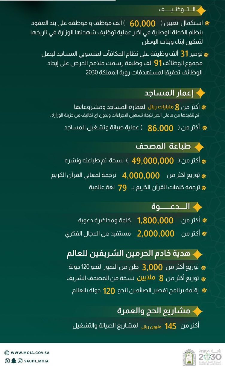 كما حققت الوزارة إنجازات كبيرة في مجال طباعة المصحف الشريف ونشره، حيث تم طباعة ونشر أكثر من (49) مليون نسخة من المصحف الشريف، إضافة إلى توزيع أكثر من (4) ملايين نسخة من ترجمة معاني القرآن الكريم، إلى جانب ترجمة كلمات القرآن الكريم إلى (79) لغة عالمية، في إطار جهود المملكة لنشر رسالة القرآن الكريم وتعزيز فهم معانيه لدى المسلمين حول العالم.