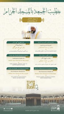 وسيتولى فضيلة الشيخ الدكتور ماهر المعيقلي بإمامة المصلين وإلقاء خطبة الجمعة في المسجد الحرام.