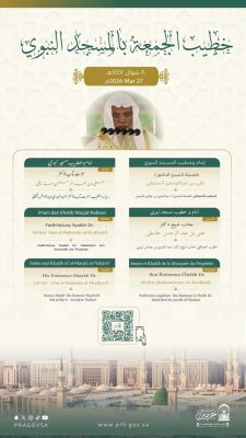 أعلنت رئاسة الشؤون الدينية بالمسجد الحرام والمسجد النبوي، عن أسماء خطيبي وأئمة صلاة الجمعة في الحرمين الشريفين ليوم 8 شوال 1447هـ وذلك ضمن جدولها الدوري لتنظيم الإمامة والخطابة.