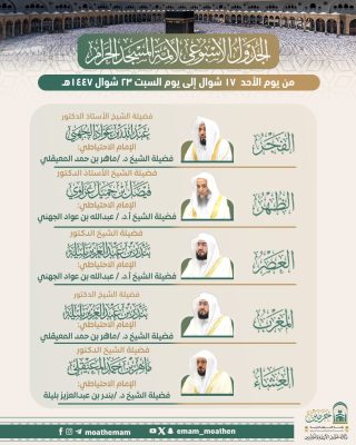 اعتمدت رئاسة الشؤون الدينية بالمسجد الحرام والمسجد النبوي الجدول الأسبوعي لأصحاب الفضيلة أئمة الحرمين الشريفين، للفترة من 17 إلى 23 شوال 1447هـ وذلك ضمن جهودها لتنظيم الصلوات وتيسير متابعتها لعموم المصلين والزوار.