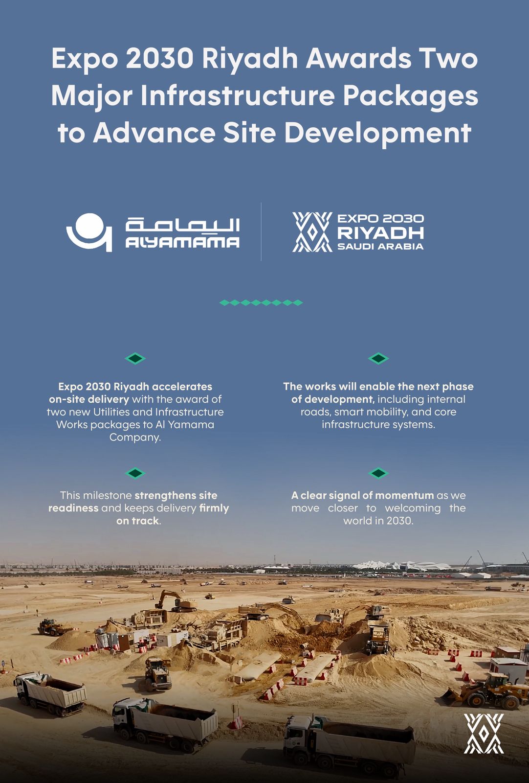 مواصلةً للتقدم المحقق في موقع إكسبو 2030 الرياض، وفي أعقاب البدء الفعلي للأعمال الإنشائية ضمن حزمة البنية التحتية الأولى التي تم ترسيتها في شهر ديسمبر الماضي على شركة نسما وشركائهم، أعلنت إكسبو 2030 الرياض عن ترسية عقدين جديدين لأعمال البنية التحتية والمرافق الأساسية على شركة اليمامة. وتأتي هذه الخطوة لتعزز الزخم المتنامي في الموقع، الذي يمتد على مساحة 6 ملايين متر مربع، ليمضي المشروع قدماً وفق الخطط المعتمدة لتقديم نسخة استثنائية من المعرض الدولي.