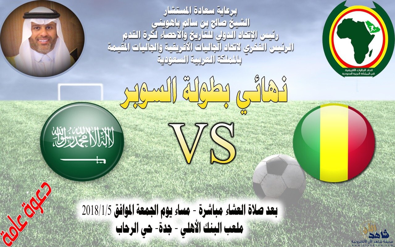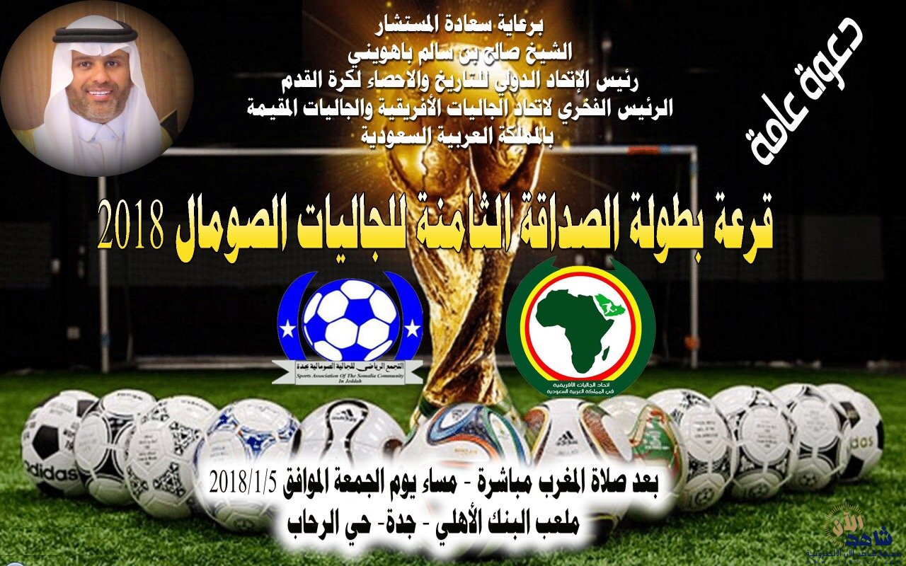 تقام مساء اليوم الجمعة وعلى ملاعب البنك الأهلي بجده مراسيم اجراء قرعة بطولة الصداقة الثامنة للجاليات (الصومال 2018) برعاية رئيس الاتحاد الدولي للتاريخ والاحصاء لكرة القدم والرئيس الفخري لاتحاد الجاليات الافريقية والمقيمة بالسعودية المستشار صالح باهويني ، وحضور رئيس اتحاد الجاليات الأفريقية الأستاذ “ديابي غوسو ناصري” وممثلي الدول المشاركة الدبلوماسيين والاداريين ومسئولي مكتب الهيئة العامة للرياضة بمحافظة جده يتقدمهم مدير المكتب الأستاذ أحمد روزي وبعض مسئولي الاتحاد السعودي لكرة القدم وإداري المنتخبات السعودية ، إلى جانب إقامة نهائي كاس السوبر للجاليات والتي تجمع فريق جالية جمهورية مالي وفريق أبناء الوطن السعودي من محافظة جده ، حيث يتم تكريم الفائز بكأس البطولة والميداليات الذهبية فيما ينال الخاسر بكاس المركز الثاني والميداليات الفضية ، وتوزيع الجوائز المعتدة في البطولة والممثلة في افضل حارس مرمى ، وافضل فريق للعب النظيف ، وافضل جماهير مشاركة ، وهداف البطولة