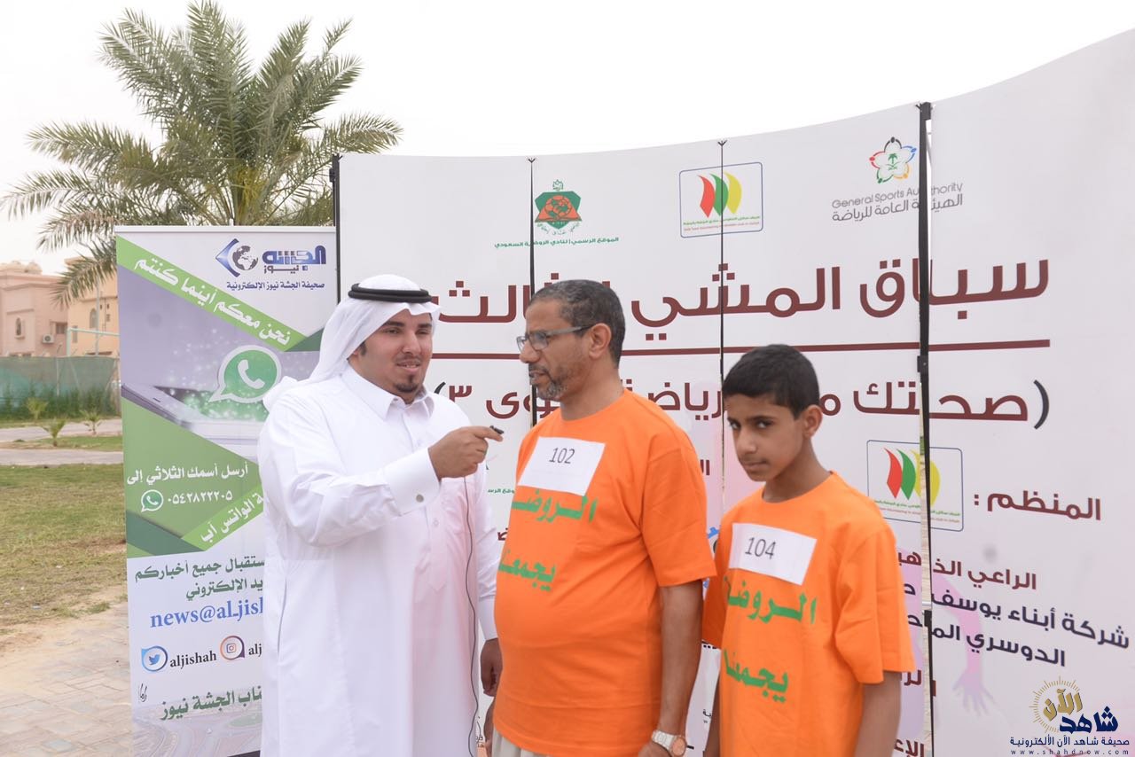 نظم فريق سالك التطوعي بنادي الروضة بالجشة سباق المشي الثالث تحت شعار ” صحتك مع الرياضة أقوى (3) ” بحضور عدد كبير من الشخصيات والوجهاء يوسف الهلال ويوسف الفهيد واعضاء مجلس إدارة نادي الروضة يتقدمهم رئيس النادي الاستاذ إيهاب الدوسري والاستاذ خالد الخنيفر و الفيصل الخنيفر وخالد الحجرف ومدير صحيفة شاهد الان الاستاذ محمد الفهيد وجمع غفير من محبي رياضة المشي .