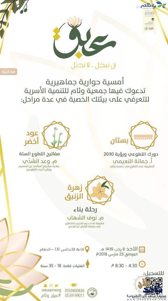 أعلنت الجمعية الخيرية للتنمية الأسرية بالمنطقة الشرقية “وئام” عن إقامة أمسية حوارية جماهيرية تهدف إلى رفع فاعلية مشاركة العنصر النسائي في العمل التطوعي في المنطقة الشرقية، ومناقشة فرص ودور المرأة في بناء مستقبل العمل التطوعي، من خلال فعالية “عبق وئام”، والتي ستقام الأحد القادم في قاعة الأندلس للاحتفالات بالدمام.