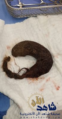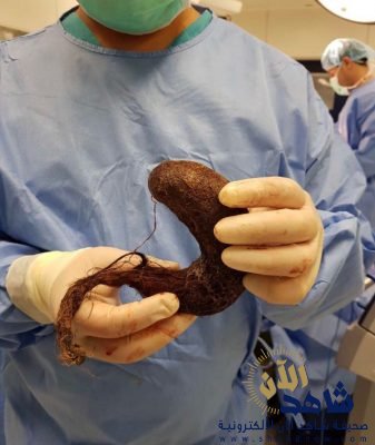 تمكن الفريق الجراحي من استخراج كتلة من الشعر من معدة طفلة سعودية تبلغ من العمر 4 سنوات وقال د.حامد الودعاني أن هذه الحالة تعد من الحالات النادرة عالميا و تعرف باسم متلازمة رابونزيل وأضاف الدكتور الودعاني أن الطفلة تعاني من آلام شديدة وفقد في الشهية ونقص في الوزن إضافة إلى ضعف في النمو الطبيعي للجسم وقد اوضحت الام بان حالة ابنتها تتدهور يوما بعد يوم مما استدعى اخذ الطفلة للمستشفيات وبالفحص الإكلينيكي وجدنا جسماً غريباً في أعلى البطن كان يتوقع أن يكون ورماً وبعد عدة فحوصات وبعد تصويره بالأشعة المقطعية تم التأكد من أن هذا الورم هو كتلة من الشعر تملى المعدة وبمراجعة الام افادت بان ابنتها تميل لاكل شعرها والخيوط المنسوجة وبعد ذلك اجريت لها عملية جراحية لستئصال كتلة الشعر من معدة الطفلة وبعد العملية تحسنت حالة الطفلة تماماً وخرجت من المستشفى كما اضاف الدكتور الودعاني ان هذه الحالة تزيد لدى الأطفال وهو يشابه أكل الأجسام الغريبة الأخرى مثل أكل التراب والطباشير وغيرها الأمر الذي يلقي على الأهل المسؤولية الكبيرة في تجنيب أطفالهم مثل هذه الأجواء التي تؤدي إلى مثل هذه الأفعال المضرة بصحتهم