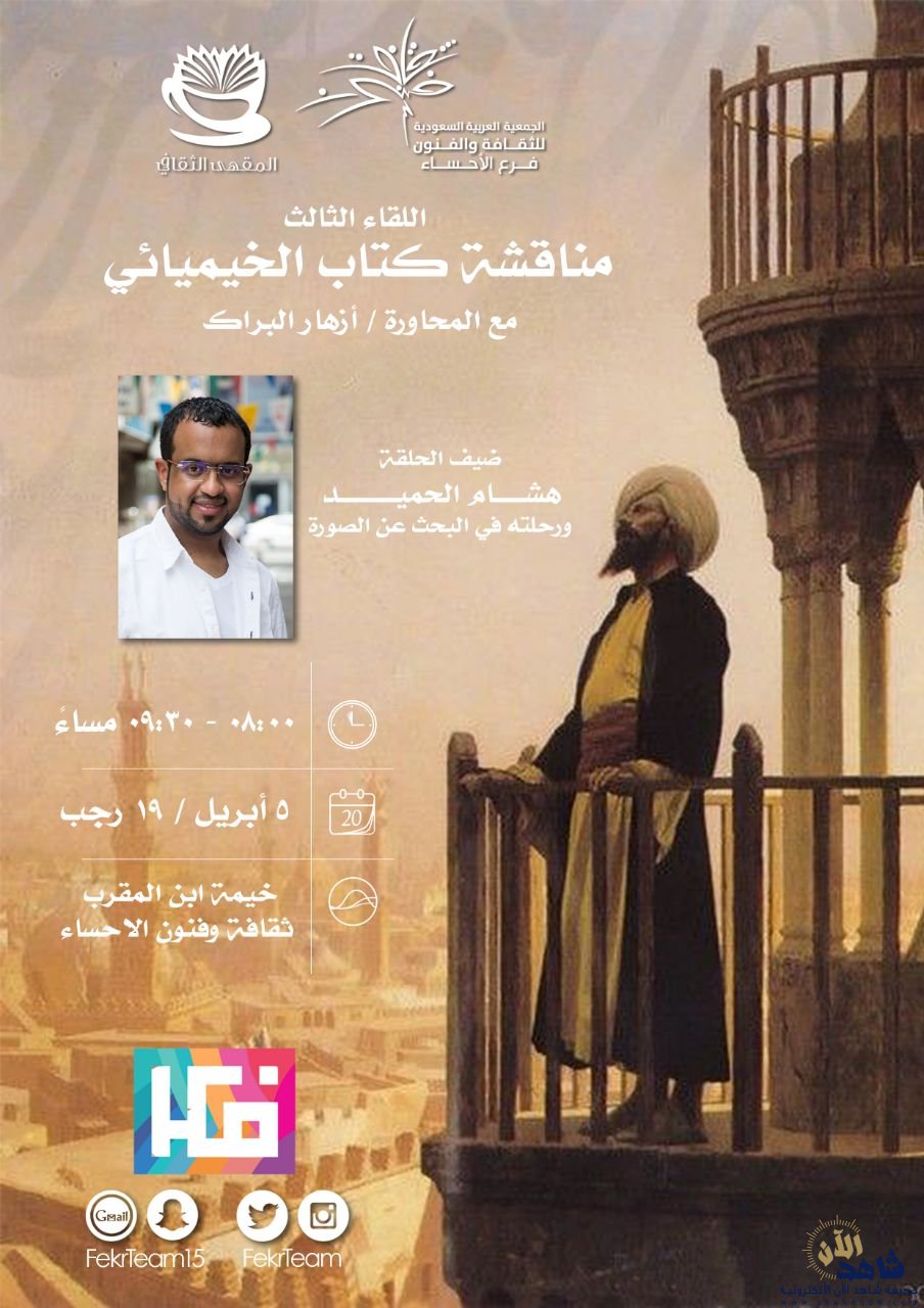 ضمن أنشطة فريق فكر للقراءة بالمقهى الثقافي بجمعية الثقافة والفنون بالأحساء يتم الاستعداد لأمسية ثقافية ومناقشة كتاب (الخيميائي) مع المحاورة الأستاذة أزهار البراك وضيف الأمسية الأستاذ هشام الحميد ورحلته في البحث عن الصورة وذلك يوم الخميس القادم ١٩ رجب ١٤٣٩ بخيمة إبن المقرب بمقر الجمعية بالمكتبة العامة بالأحساء ، وقد صرحت مشرفة الفريق الأستاذة فاطمة العلي بأن الأمسية سوف تتحدث عن الخيميائي العالم بأسرار الكون ورحلة الفتى الراعي للبحث عن أسطورته الشخصية والكنز المدفون في الشرق و الحب وحدود العابرين والإشارات الكونية في تحقيق الأسطورة الشخصية حيث نتناولها على طاولة الحوار والنقاش ، فيما أضاف مشرف المقهى الدكتور محمد البشير بأن المقهى الثقافي بالجمعية يتيح الفرصة الكاملة للشباب المثقف وكذلك الشابات وفريق فكر يحمل على عاتقه مسؤولية نشر الثقافة بشتى اشكالها وصورها وفي القادم سوف نكشف المزيد من الفعاليات الثقافية المختلفة داخل الجمعية وخارجها .