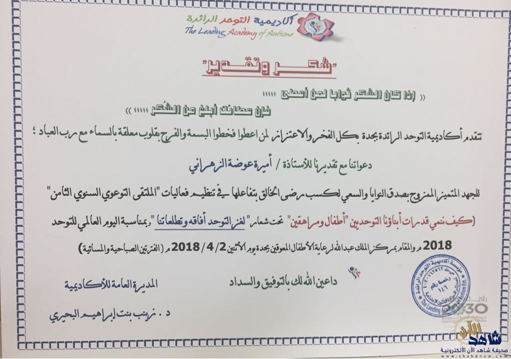 كرم الاستاذ محمد اللحياني نائب مدير مكتب العمل والتنمية الأجتماعية بمنطقة مكة المكرمةالاستاذة الاخصائية النفسية أميرة بنت عوضه الزهراني من منسوبي اكاديمية التوحد الرائدة بجدة وذلك في الاحتفال الذي اقيم امس في جمعية الملك عبدالله للاطفال المعاقين بمناسبة تدشين اليوم العالمي للتوحد في الملتقى الثامن للأكاديمية بعنوان(كيف ننمي قدرات أبنائنا التوحديين ـ أطفال ومراهقين ) وتتلقى الاستاذة أميرة الزهراني التهاني والتبريكات من الاهل والاقارب.. الف مبروك والتمنيات لها بالمزيد من التقدم والنجاحات .